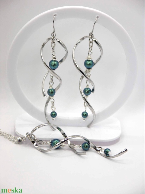 - Anyaga: preciosa cseh üveggyöngy, ezüst színű spirál alakú függő, ezüst színű nyaklánc, fülbevaló akasztó