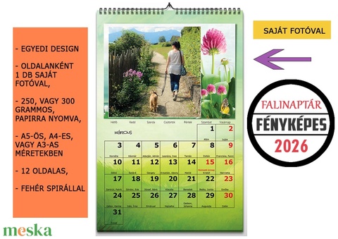 2026-os egyedi fényképes falinaptár nagyiknak, nagyszülőknek. Különleges tervezésű falinaptárammal szeretnék hozzájárulni az ajándékozás öröméhez. Vásárlásod után e-mailben megküldött visszaigazolásban fogom megírni neked, a naptár elkészítésének teljes menetét. Abban találod majd az elszámolást is, melyet előreutalással kell rendezned. A falinaptár 2 féle minőségben és 3 féle méretben (A5, A4, A3) készül. Mindkét minőség kiváló, 250 grammos, vagy 300 grammos papírra nyomódik, év végén sem fog a faltól felgöngyölődni. A falinaptár 12 oldalas, attól a hónaptól indul amelyikkel szeretnéd. Előlap külön ár ellenében kérhető! (450.-Ft/oldal) Szükséges fotók száma: 12 db