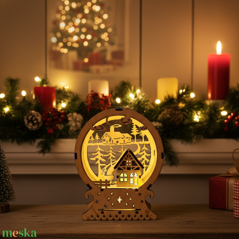 Ez a több rétegű, 3D hatású dekoráció egy komplett téli tájképet zár magába: egy erdei házikót, mellette szarvast, fenyőfákat és a csillagos, holdfényes éjszakai égboltot. A beépített LED fényforrás meleg, sárgás fénnyel világítja meg a jelenetet, mintha a házikó ablakai és a csillagok valóban ragyognának a sötétben.