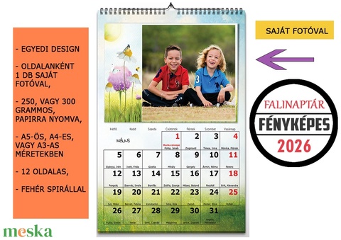 2026-os egyedi fényképes falinaptár nagyiknak, nagyszülőknek. Különleges tervezésű falinaptárammal szeretnék hozzájárulni az ajándékozás öröméhez. Vásárlásod után e-mailben megküldött visszaigazolásban fogom megírni neked, a naptár elkészítésének teljes menetét. Abban találod majd az elszámolást is, melyet előreutalással kell rendezned. A falinaptár 2 féle minőségben és 3 féle méretben (A5, A4, A3) készül. Mindkét minőség kiváló, 250 grammos, vagy 300 grammos papírra nyomódik, év végén sem fog a faltól felgöngyölődni. A falinaptár 12 oldalas, attól a hónaptól indul amelyikkel szeretnéd. Előlap külön ár ellenében kérhető! (450.-Ft/oldal) Szükséges fotók száma: 12 db