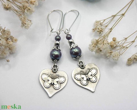 Gyöngyházfényű, színjátszós Preciosa üveggyöngyökből és lepkés, szív alakú függőkből készült fülbevaló