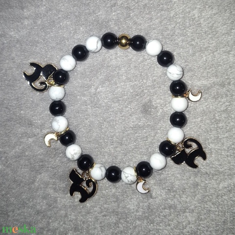 Ónix és howlit ásványkarkötő cica és hold medálokkal