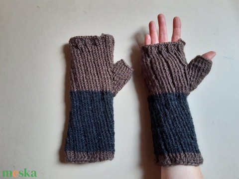 Barna-fekete színű 100 % gyapjúból kötöttem a kesztyűt, férfi méret. Teljes hossza 23 cm, csuklóhossz 13 cm, tenyérhossz 10 cm. Rugalmas, min.18 cm csuklóméretre kötöttem. A kesztyű szélessége 9 cm nyugalmi állapotban.