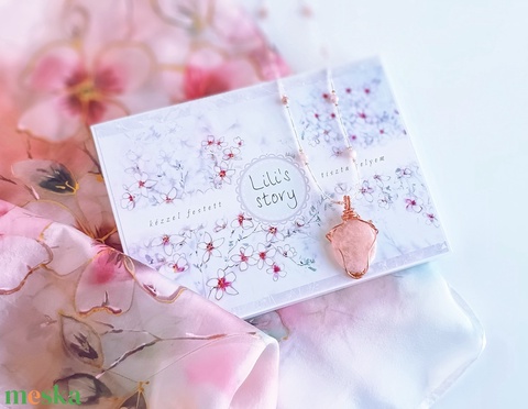 - Anyaga: hernyóselyem, hőfixált festék, ásvány gyöngyök, ásvány medál, rézdrót, papír, réz