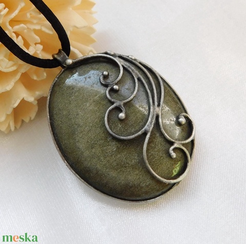 A medál Tiffany technikával készült arany obszidián és ólommentes, ezüsttartalmú ón felhasználásával. A díszítés szintén saját készítésű, nem tartalmaz gyári elemeket. A fémrészt óezüstre patináztam és lelakkoztam, hogy sokáig szép maradjon.