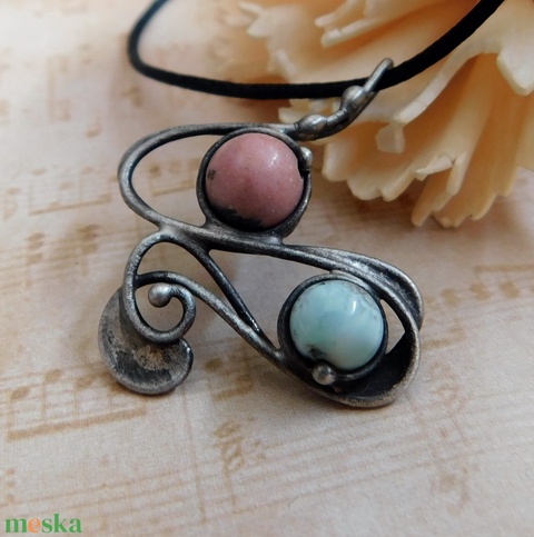 A medál Tiffany technikával készült rodonit, larimár, réz és ólommentes, ezüsttartalmú ón felhasználásával. A díszítés szintén saját készítésű, nem tartalmaz gyári elemeket. A fémrészt óezüstre patináztam és lelakkoztam, hogy sokáig szép maradjon.