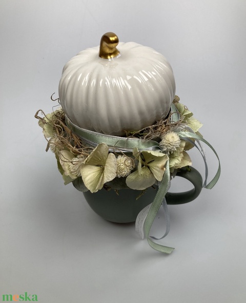 Fehér kerámiatökkel töltött bögre különféle növényi részekkel és szalaguszállyal ékítve - tartós virágdísz