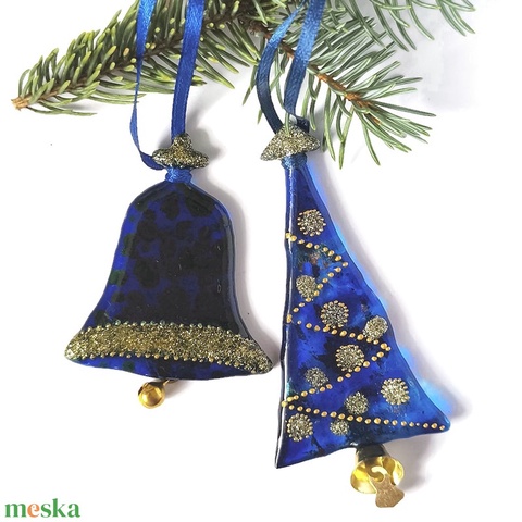 Harang és fenyőfa formájú kék üveg karácsonyfadísz arany dísztéssel