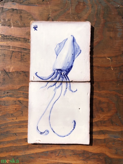 Kézzel festett mázazott portugál csempekép Tintahal, 2 db-os kompozíció