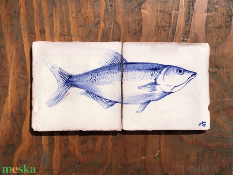 Kézzel festett mázazott portugál csempekép hal, 2 db-os kompozíció