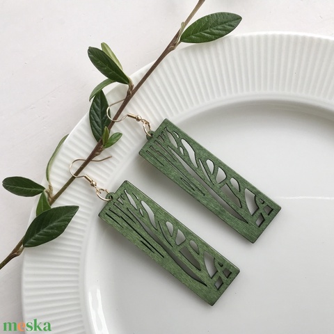 Természetes fa fülbevaló, zöld levelek mintával - Mesedoboz