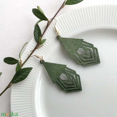 Természetes fa fülbevaló, zöld geometria mintával - Mesedoboz