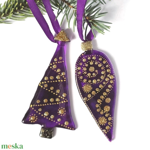 Csepp és fenyőfa formájú lila üveg karácsonyfadísz arany díszítéssel
