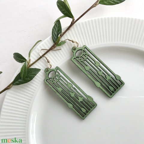 Természetes fa fülbevaló, zöld vízcsepp mintával - Mesedoboz