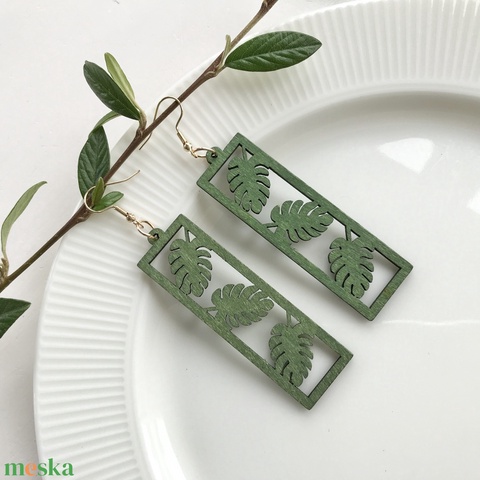 Természetes fa fülbevaló, zöld levelek mintával - Mesedoboz