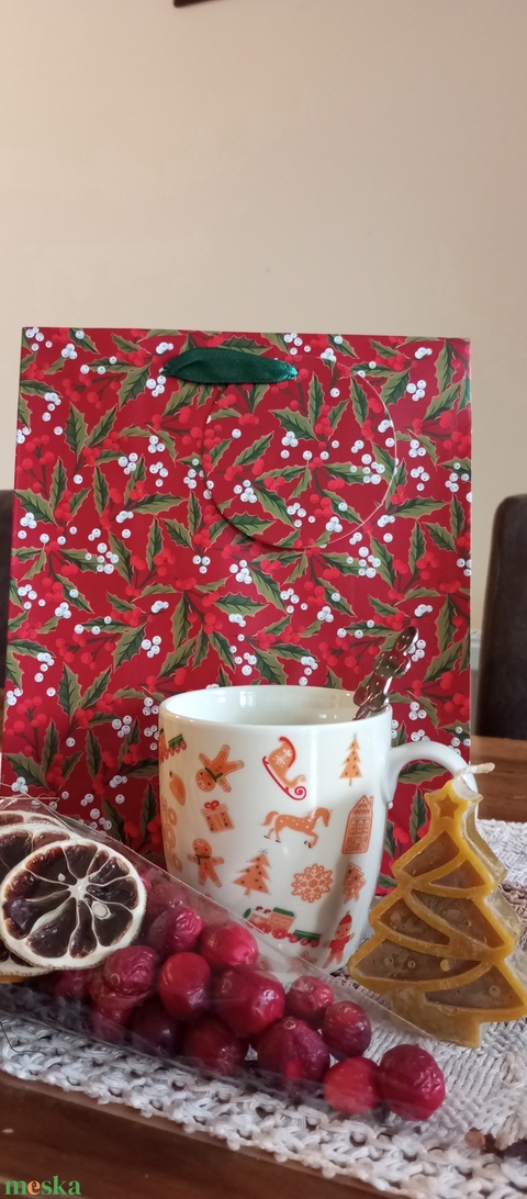 táska, tea csomag, bögre, méhviasz, karácsonyfa, mézi