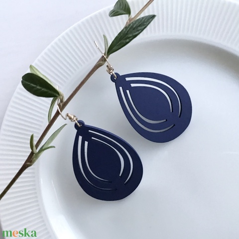 Fából készült fülbevaló, sötétkék csepp mintával - Mesedoboz
