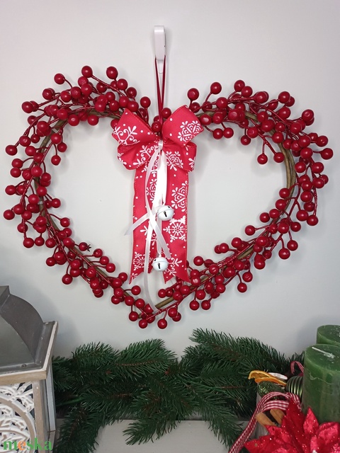 Szív alakú piros bogyós téli, karácsonyi kopogtató, koszorú