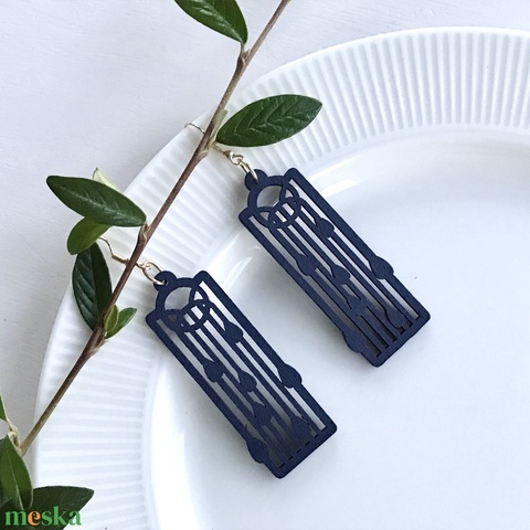 Fából készült fülbevaló, sötétkék vízcsepp mintával - Mesedoboz