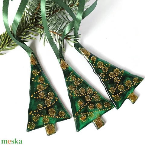 Zöld fenyőfák, arannyal díszített üveg karácsonyfadíszek