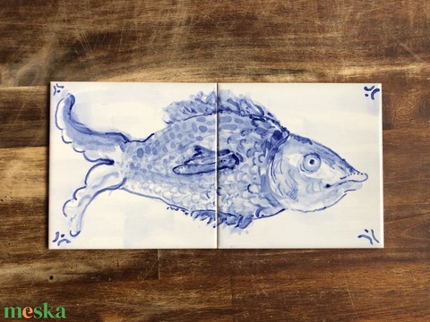 Kézzel festett mázazott portugál csempekép hal, 2 db-os kompozíció