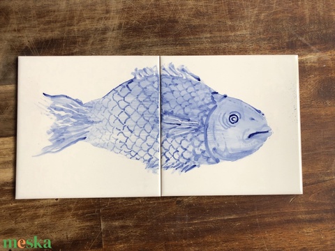Kézzel festett mázazott portugál csempekép hal, 2 db-os kompozíció