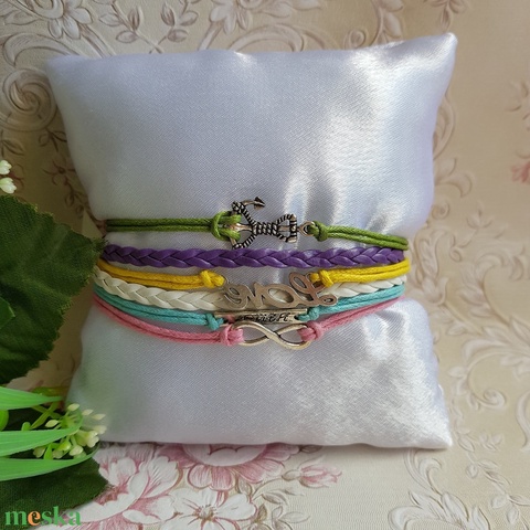 Színes, tarka műbőr karkötő fém díszekkel - horgony, LOVE, faith, végtelen jel