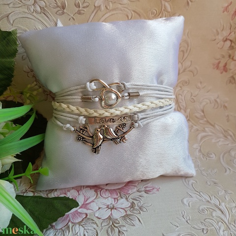 Fehér műbőr karkötő fém díszekkel - galamb, LOVE, szív