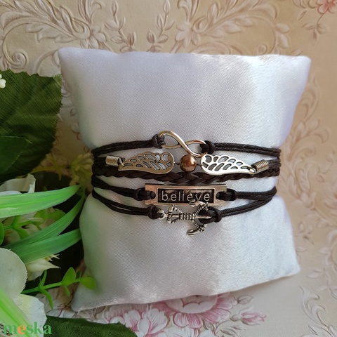 Barna műbőr karkötő fém díszekkel - horgony, believe, szárny, végtelen jel