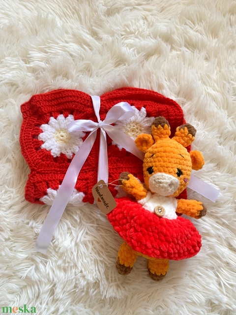 Horgolt baba csomag zsiráf plüssel és virágos pléddel