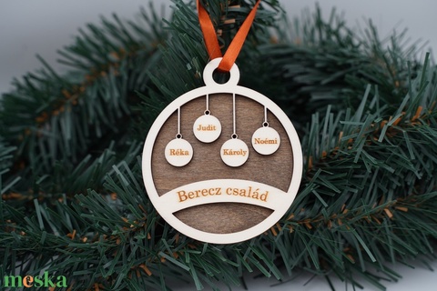 Családi 3D-s gravírozott, fa, karácsonyfadísz