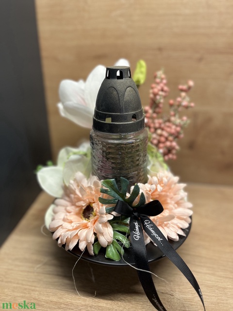- Anyaga: élethű selyemvirág, szatén szalag, gyertya, üveg