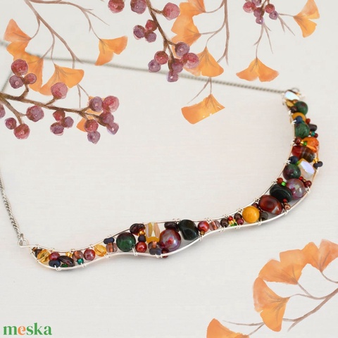 üveg, rézmagos ezüst oxidációt gátló bevonattal, nemesacél lánc és szerelékek, gránát féldrágakő, jáspis féldrágakő, zoizit rubin féldrágakő