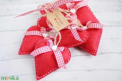 Karácsonyi filc díszek, piros szívek kockás masnival
