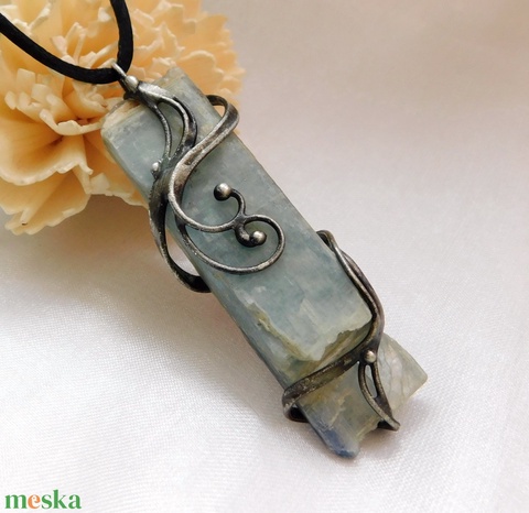 A medál Tiffany technikával készült gyönyörű nyers kianit (disztén), réz és ólommentes, ezüsttartalmú ón felhasználásával. A díszítés szintén saját készítésű, nem tartalmaz gyári elemeket. A fémrészt óezüstre patináztam és lelakkoztam, hogy sokáig szép maradjon.