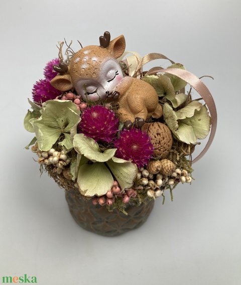 Pasztell bordó ősz - kerámiakaspós, jobb oldalán szundító bájos őzikés tartós virágdísz változatos növényanyaggal
