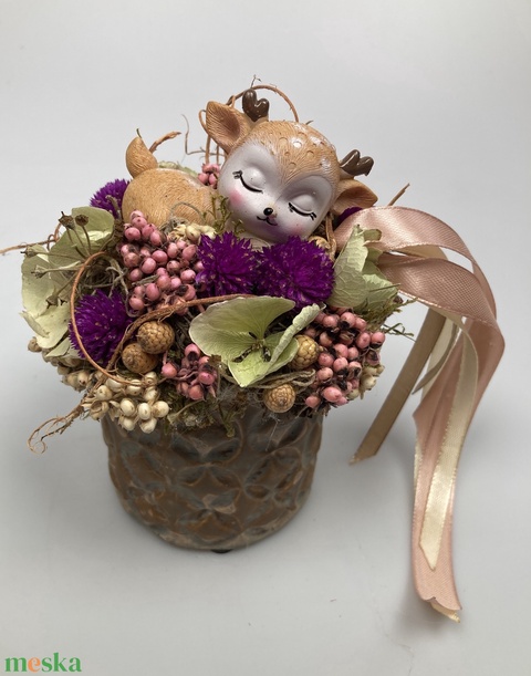 Pasztell lila ősz - kerámiakaspós, hasán szundító bájos őzikés tartós virágdísz változatos növényanyaggal