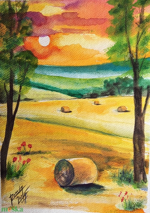 "Nyár vége" Eredeti akvarell festmény, mező, természet, ősz