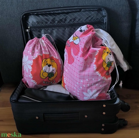 Szennyestartó zsák szett utazáshoz táskába, bőröndbe rózsaszín alapon macis