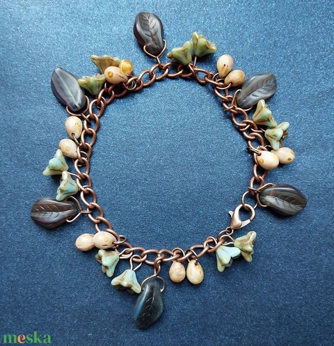 - Anyaga: szerelőkarikák, delfinkapocs, üveggyöngyök, réz lánc
