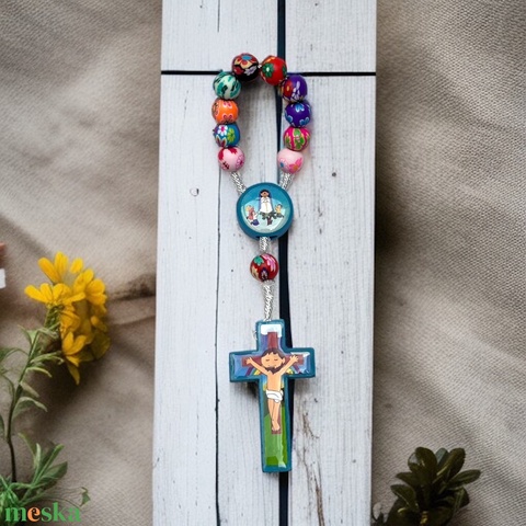 Gyerek kisfiú tizedes rózsafüzér színes mintás gyöngyökből (kék)
