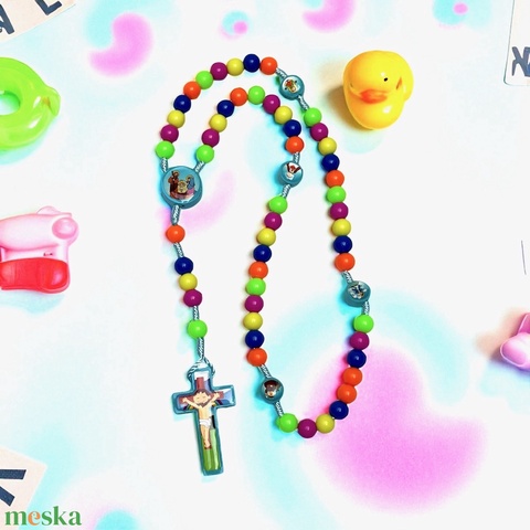 Gyerek rózsafüzér színes mintás gyöngyökből kék