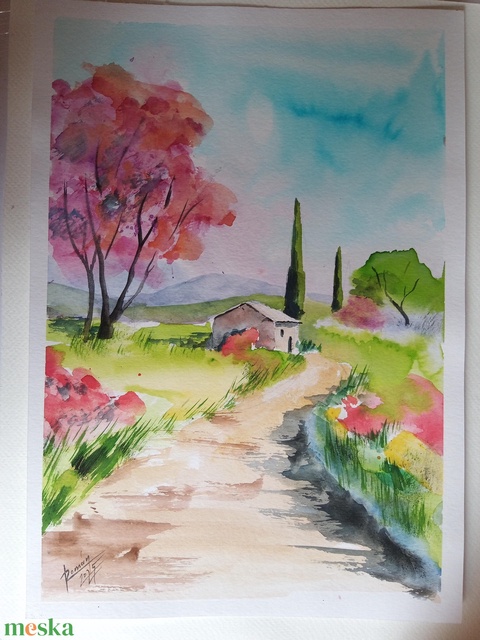 "Mediterán nyár" Eredeti akvarell festmény, olasz táj, mező, természet, ősz