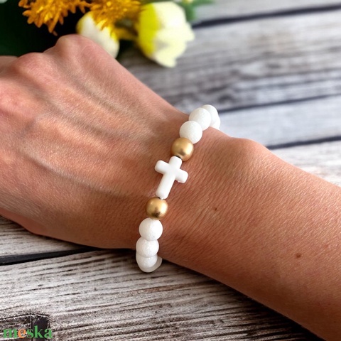 Kereszt medálos ásványkarkötő tejkvarc hematit 5640018