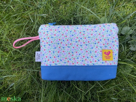 Apró virágos pipere táska kék szövettel, sárga-kék cipzárral