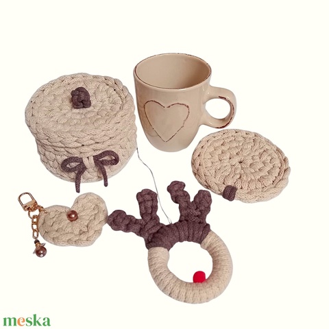 A horgolt, fedeles ékszertartó kosárka, a poháralátét, a szívecske és a karácsonyfadísz drapp és sötétbarna zsinórfonalból készültek.