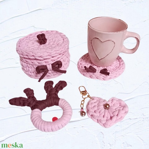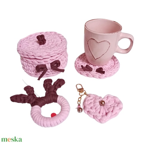 A horgolt, fedeles ékszertartó kosárka, a poháralátét, a szívecske és a karácsonyfadísz rózsaszínű zsinórfonalból és sötétbarna pólófonalból készültek.