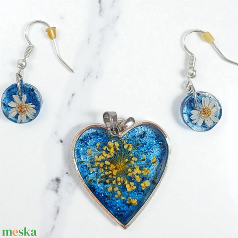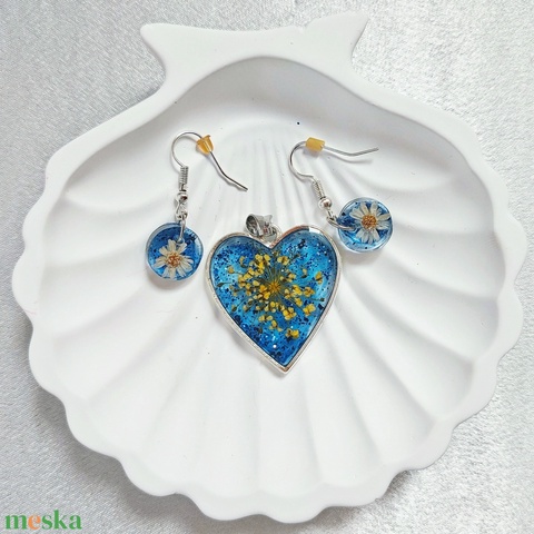 Égi Harmónia - Valódi Virágos Szív Medál és Fülbevaló Szett, Égkék Műgyanta Ékszer