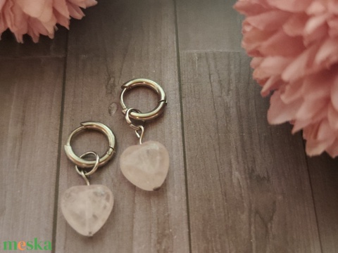 Nemesacél karika fülbevaló szívecskés Rózsakvarc medállal!