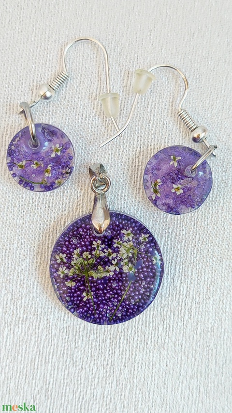 Éjkék Virágmező – Lila Gyöngyös Műgyanta Ékszerszett (Medál és Fülbevaló), Kerek Forma